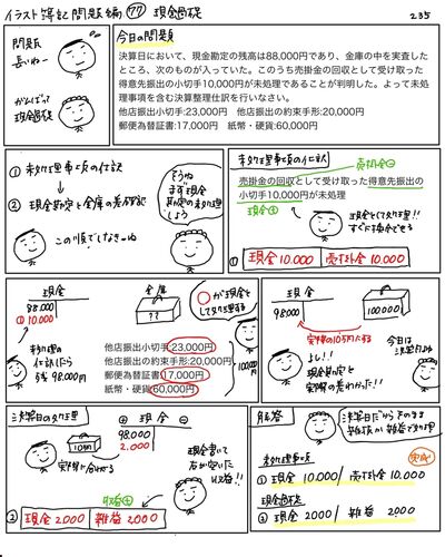 日商簿記3級を学習される方へおさらいができるように問題を一つずつ出題しています。これから学習する方は、簿記きほんのきからご覧ください!! 今回は、現金過不足を決算日に発見した時の仕訳です。 問題77現金過不足の仕訳 仕訳解答 解き方解説 ①未処…
